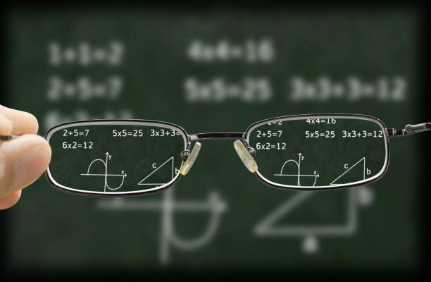 blurry vision of a green chalkboard with mathematic calculation on it corrected by the glasses