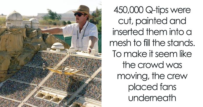 450.000 wattenstaafjes werden afgesneden, geverfd en in een gaas gestoken om de tribunes te vullen. Om het te laten lijken alsof het publiek bewoog, plaatste het team ventilatoren eronder.