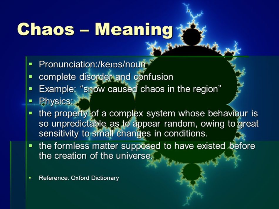 complete disorder and confusion. Example: snow caused chaos in the region Physics: the property of a complex system whose behaviour is so unpredictable as to appear random, owing to great sensitivity to small changes in conditions. the formless matter supposed to have existed before the creation of the universe. Reference: Oxford Dictionary.