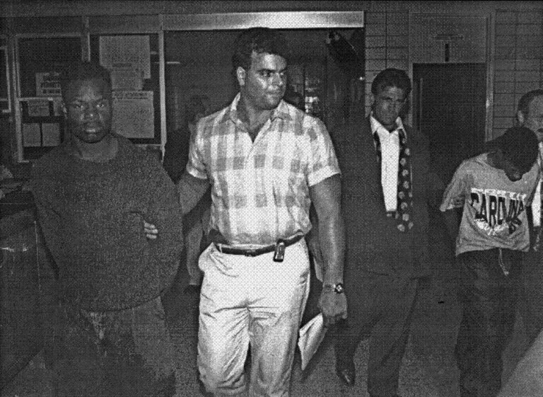 John Bunn, 14, right, and Rosean Hargrove, 17, arrested at the 77th Precinct in Brooklyn in August 1991. NYPD Detective Louis Scarcella (open jacket and loose tie) holds Bunn. – Dan Godfrey/New York Daily News/Getty Images