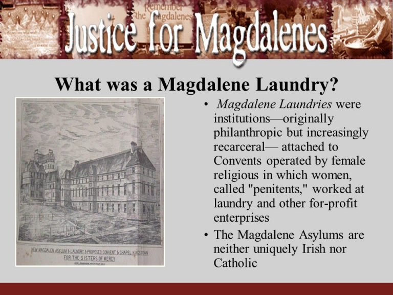“The Magdalene Laundries” were institutions operated by Roman Catholic religious orders in Ireland and other countries, primarily from the 18th to the late 20th centuries. They were intended to provide shelter and reform for “fallen” or “wayward” women, including those who were considered “fallen” due to being pregnant out of wedlock or engaging in perceived immoral behavior.