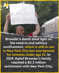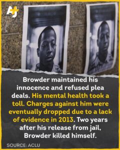 The charges against him eventually were dismissed and he was released in 2013. Less than two years after his release, haunted by his experiences in jail, Browder took his own life. His detention and death caused public outcry and spurred calls for reform, fueling national discussions about race, criminal justice and juvenile punishment.