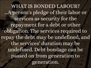 Wat is slavenarbeid? …Het in onderpand geven van arbeid of diensten door een persoon als zekerheid voor de terugbetaling van een schuld of een andere verplichting. De diensten die nodig zijn om de schuld terug te betalen, kunnen onbepaald zijn, en de duur van de diensten kan onbepaald zijn. Schuldslavernij kan van generatie op generatie worden doorgegeven.