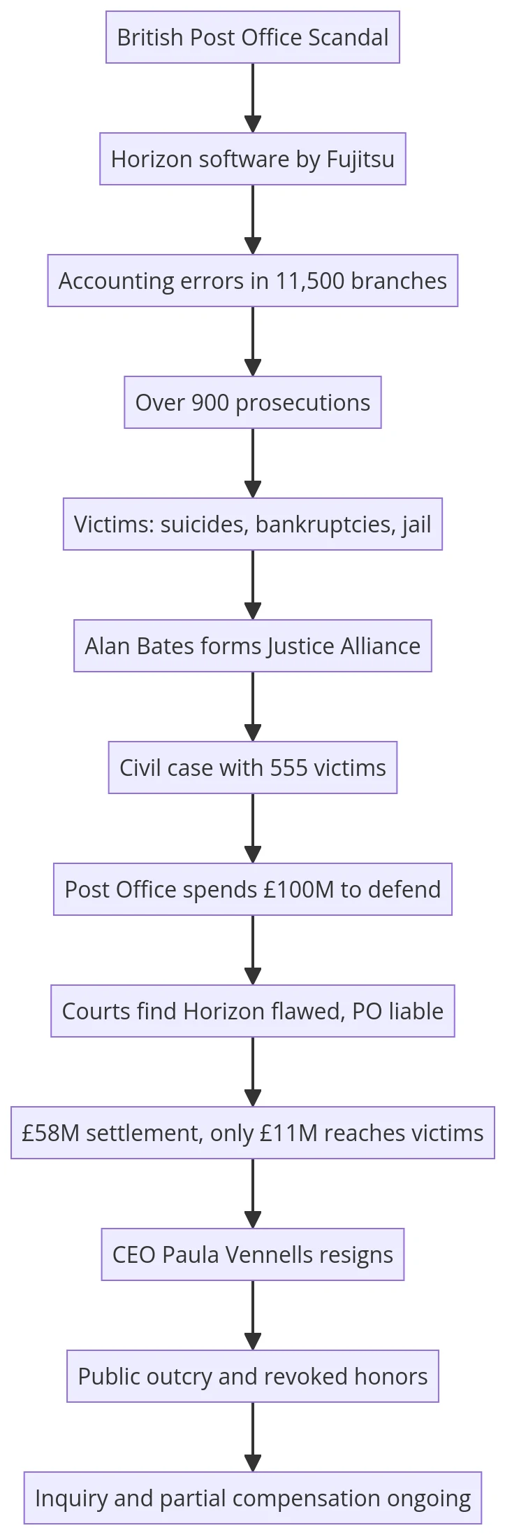 CEOs like Paula Vennells and Adam Crozier enjoyed promotions and honors despite their roles in the scandal. Vennells walked away with millions, only recently relinquishing her CBE amid public outrage in 2024.📉 Delayed Justice and Limited Compensation