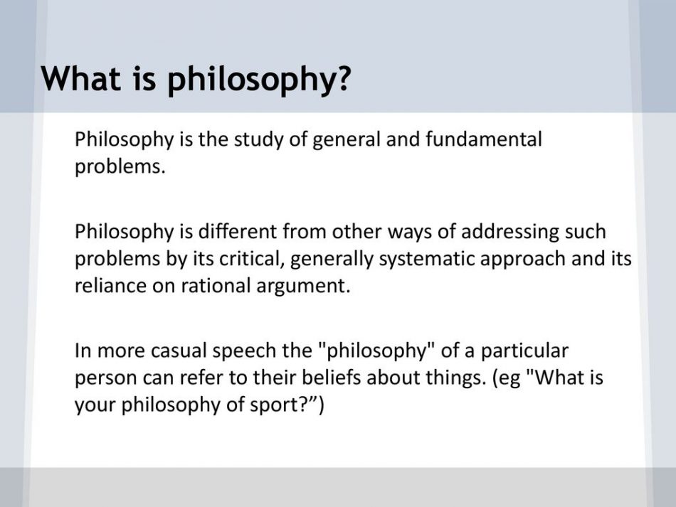 Philosophy is different from other ways of addressing such problems by its critical, generally systematic approach and its reliance on rational argument.