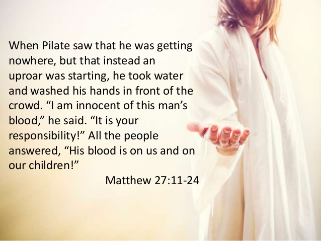 In an attempt to absolve himself of responsibility for Jesus’ death, Pilate takes a bowl of water and publicly washes his hands, saying, “I am innocent of this man’s blood; see to it yourselves.”