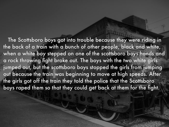 On March 25, 1931, nine African American teenagers were accused of raping two white women aboard a Southern Railroad freight train in northern Alabama. Haywood Patterson, Olen Montgomery, Clarence Norris, Willie Roberson, Andy Wright, Ozzie Powell, Eugene Williams, Charley Weems and Roy Wright were searching for work when a racially-charged fight broke out between passengers. The fight is said to have started when a young white man stepped on the hand of one of the Scottsboro Boys.