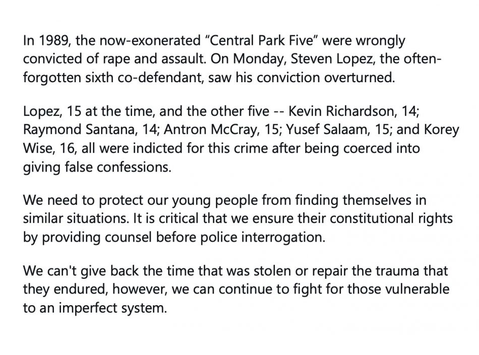“Today is an important moment, not just for the DA’s office, but for Manhattan, New York City and the entire criminal justice system. So many largely forgot that there were six who were falsely accused of rape of the Central Park jogger. Today, Mr. Lopez joined the other five who had their convictions vacated. What is so striking to me is how young Mr. Lopez was when both he was arrested and then when he pled guilty under extraordinary pressure. He saw the outcome of two trials, not one, but two trials of the five other teenagers charged before him. He was questioned in the middle of the night. He was implicated by unreliable forensic evidence and by statements. And as many of you will recall, he was up against incredible public scrutiny.”