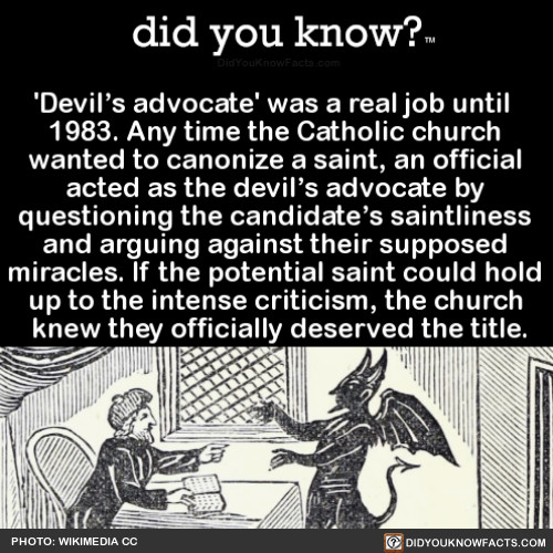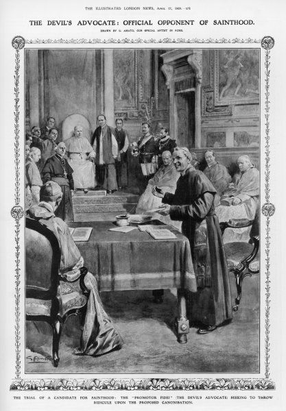 Voordat in de katholieke kerk iemand door de paus heilig werd verklaard, moet er eerst in Rome een uitvoerig proces plaatsvinden. Daarbij was ook een tegenstander: de advocaat van de duivel. Die komt dan met allerlei argumenten waarom de aanstaande heilige juist niet heilig genoemd mag worden.