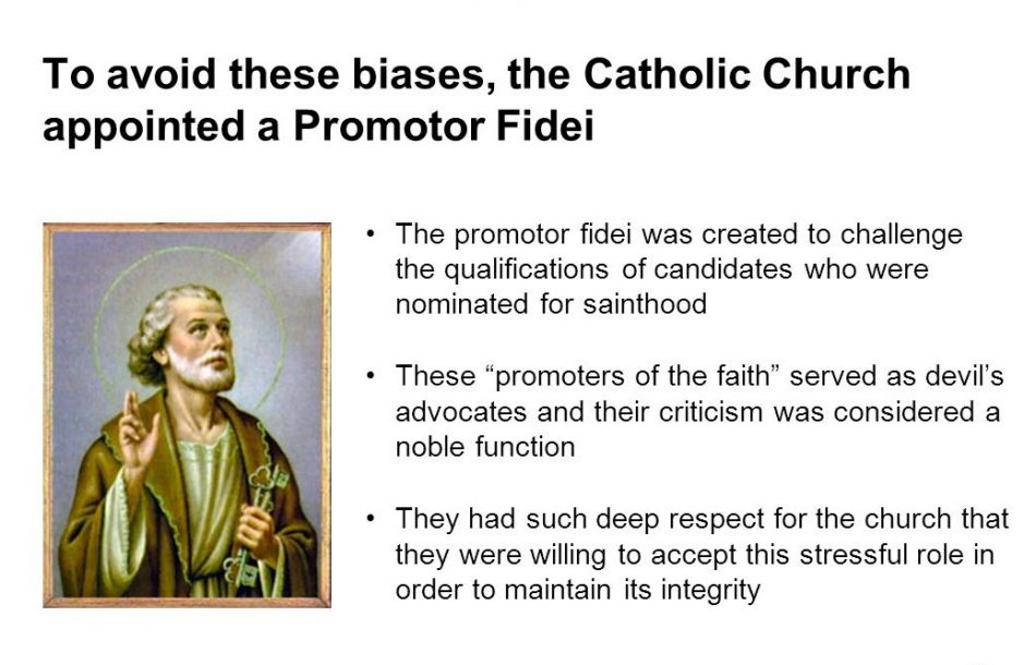 One approach takes its name from a role in Catholic Church law: the advocatus diaboli. The function of this person is to present arguments against the canonisation of someone who is being proposed for canonisation (e.g. serious character defects, or the misrepresentation of the necessary miracles – fake news, if you will).