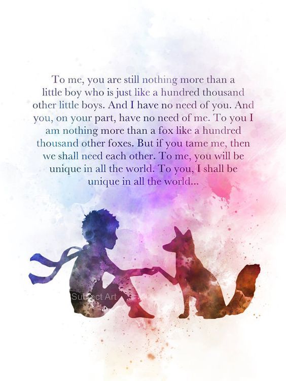 “Just that,” said the fox. “To me, you are still nothing more than a little boy who is just like a hundred thousand other little boys. And I have no need of you. And you, on your part, have no need of me. To you, I am nothing more than a fox like a hundred thousand other foxes. But if you tame me, then we shall need each other. To me, you will be unique in all the world. To you, I shall be unique in all the world . . .”