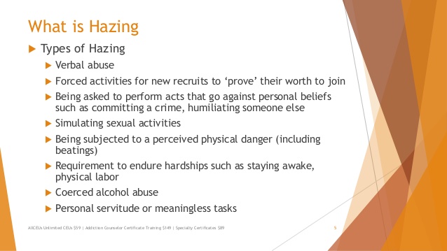 Forms of hazing: Hazing can take various forms, including but not limited to, physical abuse such as paddling, hitting, or forcing someone to eat or drink substances; emotional or psychological abuse such as humiliation, intimidation, or isolation; and sexual harassment or assault.