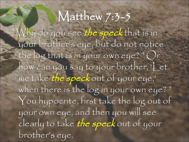 3 Why do you see the speck that is in your brother’s eye, but do not notice the log that is in your own eye 4 Or how can you say to your brother, ‘Let me take the speck out of your eye,’ when there is the log in your own eye 5 You hypocrite, first take the log out of your own eye, and then you will see clearly to take the speck out of your brother’s eye.