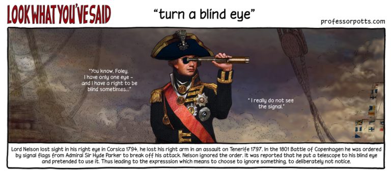 The phrase “turn a blind eye” originates from an event involving Vice Admiral Horatio Nelson during the Battle of Copenhagen on April 2, 1801. While leading the British Fleet, Nelson continued fighting after receiving a signal to retreat. His superior, Admiral Sir Hyde Parker, was concerned for Nelson’s safety and ordered the retreat. However, Nelson, who had lost sight in one eye, held up his telescope to his blind eye and famously declared, “I have only one eye, and I have a right to be blind sometimes… I really do not see the signal!” Nelson ignored the order and went on to win the battle, a victory that ultimately led to his historic success at the Battle of Trafalgar. The phrase now means to deliberately ignore or refuse to acknowledge something.